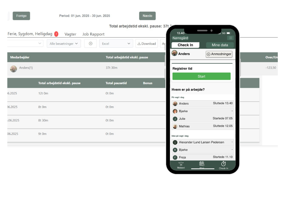 Gør det nemt at se og planlægge, hvem der skal arbejde hvor og hvornår. Som leder kan du sikre, at alle vagter altid er dækket, så de rigtige medarbejdere møder på arbejde. Vi ved, at planer hurtigt kan ændre sig, og derfor kan vagter justeres med få klik.